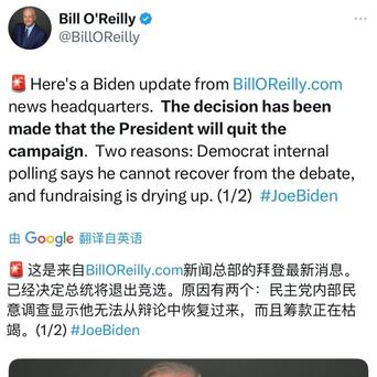 美国著名政治节目电视主持人比尔·奥莱利今天(7月1日)发文说:“拜登已经决定总统将退出总统竞选。原因有两个:民主党内部民意调查显示他无法从辩论中恢复过来,而且筹款正在枯竭。所以,乔的选举就此结束了。但白宫还不知道何时以及如何宣布这一消息。”